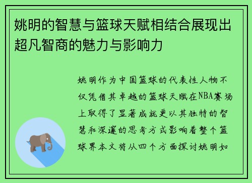 姚明,这位中国篮球的传奇人物,以其卓越的球技和无与伦比的人格魅力,深深影响了全球篮球的发展。在他的职业生涯中,姚明不仅在NBA赛场上书写了辉煌的篇章,还成功将中国篮球推向了世界舞台。本文将从四个方面探讨“姚明进化镜框”的背后故事,以及它与姚明的篮球传奇之间的完美结合。这四个方面分别是:姚明的成长背景、他在NBA的奋斗历程、姚明退役后的影响力以及“进化镜框”这一概念如何象征着他的职业生涯和精神传承。...